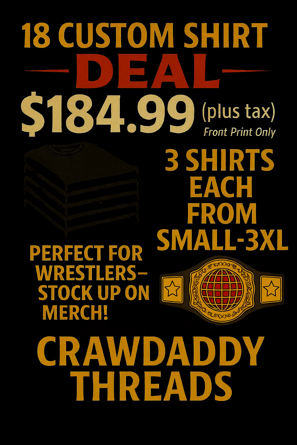 Get your merch game on with our 18 custom shirt bulk deal! Perfect for pro wrestlers looking to get started in the industry. With this easy bulk deal, take a step in the right direction towards promoting your brand and increasing sales. Elevate your merch game today!